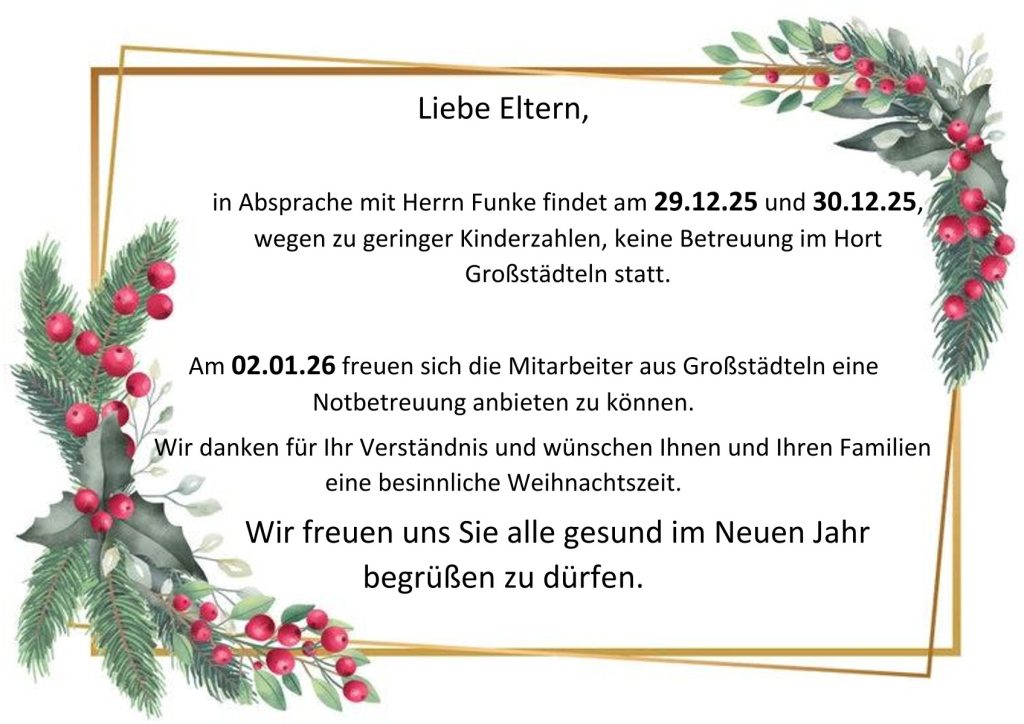 Erstellt am23.12.202523.12.2025 Startseite / Informationen / Notbetreuung in der Weihnachtszeit Informationen Notbetreuung in der Weihnachtszeit